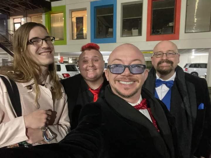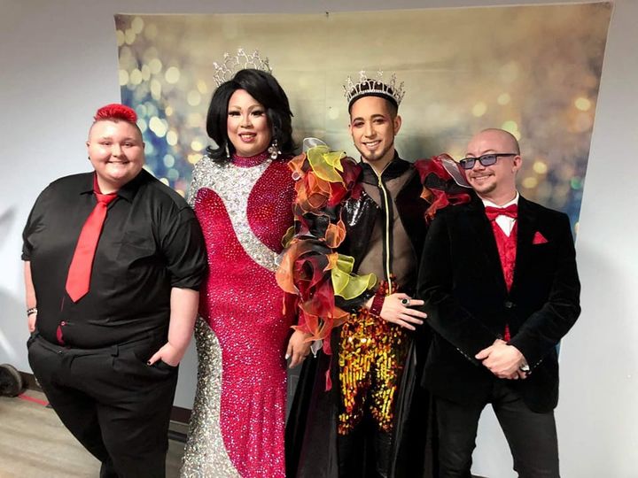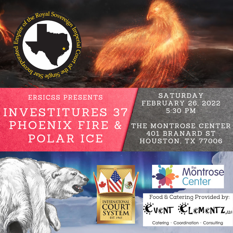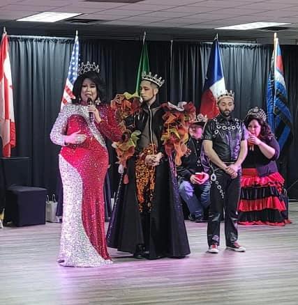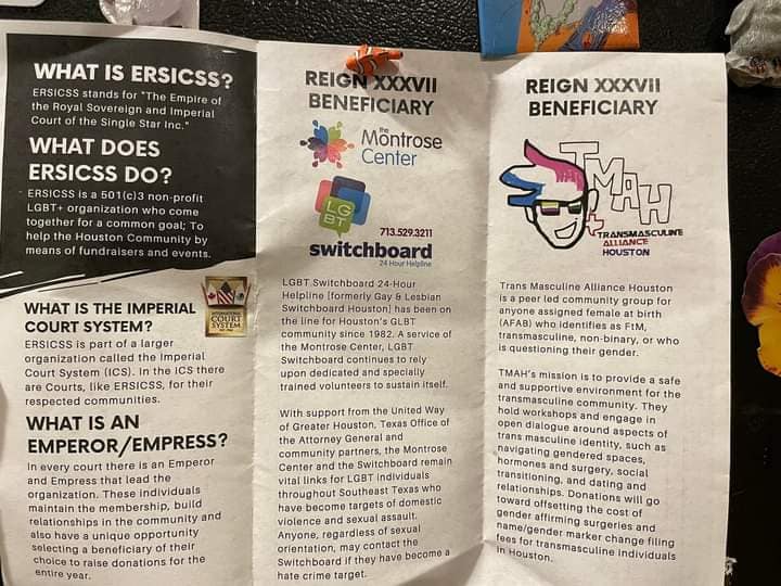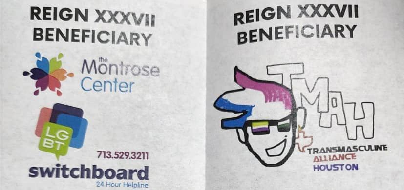 Myes and George represented Transmasculine Alliance Houston at Investitures 37, which is the event where the emperor and empress of The Empire of the Royal Sovereign and Imperial Court of the Single Star, Inc. announce their line of succession and name their beneficiaries. Emperor 37, Landon J. Fatale, announced LGBT Switchboard Houston as his beneficiary and Empress 37, Ivanna Cupcake, announced Transmasculine Alliance Houston as her beneficiery. They will hold shows and fundraisers throughout the year and present these donations to their beneficiaries at the 38th Investitures next year.